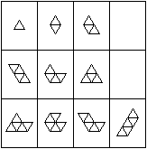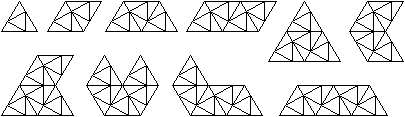 On retrouve ces « petits » polyiamonds dans Mini-IAMOND RING de Kate Jones et Tetrapentos de Jacques Ferroul (voir aussi Tet’Pen’). Ci-dessous, les « petits » polyiamonds sur la grille de RayMag :