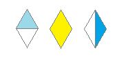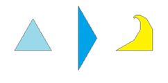2) Si on prend comme unité de longueur le côté du triangle bleu clair, la longueur du plus grand côté du triangle bleu foncé est la racine carrée de 3. J’ai cherché des formes faisant intervenir d’autres racines carrées : il y avait les polytans (ou polyisorthes) avec la racine carrée de 2. J’ai créé les polyrhizes, assemblages de 4 triangles de même aire faisant intervenir les racines carrées de 2, 5 et 10 (voir Polyrhizes) 3) Les pièces de Polyspid’ sont aussi des polymultiformes ; elles sont obtenues par la juxtaposition de 3 formes de même aire :