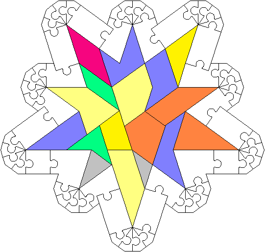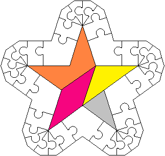 Elle a 10 angles de 288° ; l’angle de 288° est si grand et l’angle extérieur si petit que nous ne pouvons pas mettre une bordure d’angle avec 2 côtés de longueur 1 ; nous sommes obligés d’utiliser une des 3 pièces suivantes :