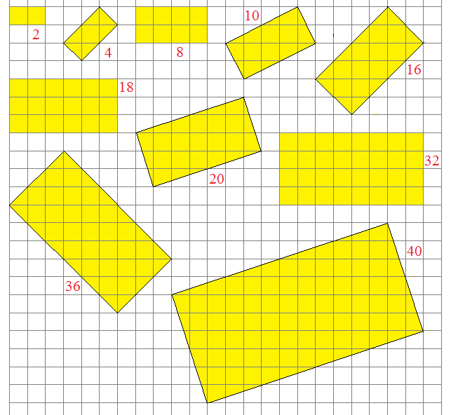 4) Formes à reconstituer : A l’aide de certains des 24 birhizes et éventuellement de certains des 4 monorhizes, essayez de reconstituer les rectangles suivants (les aires sont marquées en rouge):