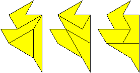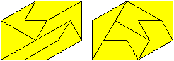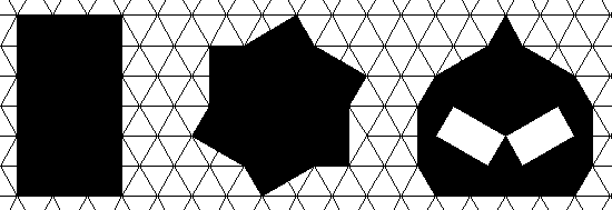 Les deux triangles bleus ci-dessus ont la même aire ; les formes obtenues par juxtaposition de plusieurs triangles semblables au triangle bleu clair sont des polyformes appelées polyiamonds (comme les pièces de Tet’Pen’) ; les formes obtenues par juxtaposition de plusieurs triangles semblables au triangle bleu foncé sont des polyformes appelées polypons. |
